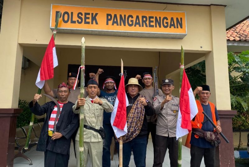 Rangkaian kegiatan Kapolsek Pangarengan bersama anggota melaksanakan apel pagi dengan menggunakan pakaian veteran dan pakaian adat madura dengan membawa peralatan bambu runcing dan clurit.