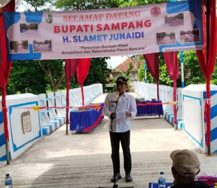 Liputanmadura.com (Sampang) Jawa Timur – Bupati Sampang H. Slamet Junaidi resmikan Jembatan Mangar, Jembatan Somber, Jembatan Gantung Desa Rahayu, Jembatan Daleman, Jembatan Bapelle, serta Embung Palenggiyan. yang dibangun melalui program hibah rehabilitasi dan rekonstruksi pascabencana dari Badan Nasional Penanggulangan Bencana (BNPB). Bantuan hibah senilai Rp10,29 miliar rupiah.”Rabu 3 Desember 2025.