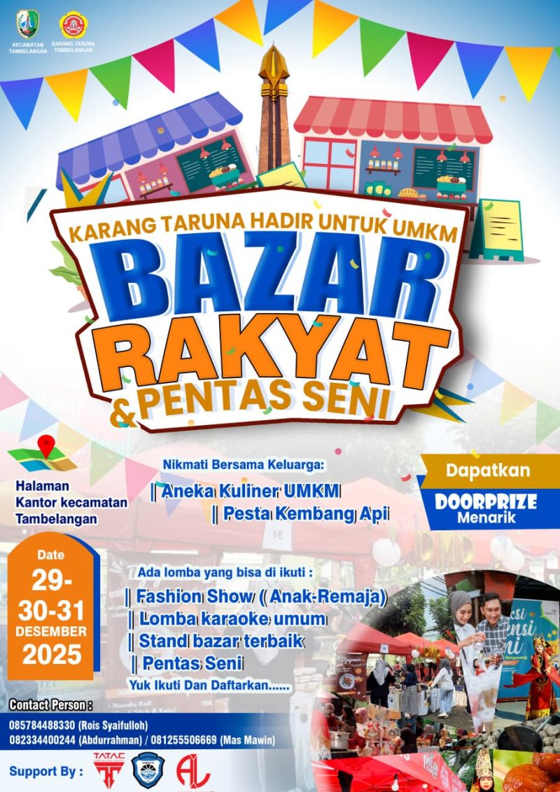 Liputanmadura.com (Sampang) Jawa Timur – Karang Taruna (Katar) Kecamatan Tambelangan dan Pemuda Tambelangan Bersatu Menggelar acara “Bazar Rakyat dan Pentas Sini” aneka Kuliner UMKM serta pesta kembang api. Menjadi Ajang silaturahmi sekaligus Wadah Para pelaku UMKM di wilayah Kecamatan Tambelangan. Kegiatan ini gelar Kantor Kecamatan Tambelangan selama tiga hari tiga malam pada tanggal 29-30-31 Desember 2025.