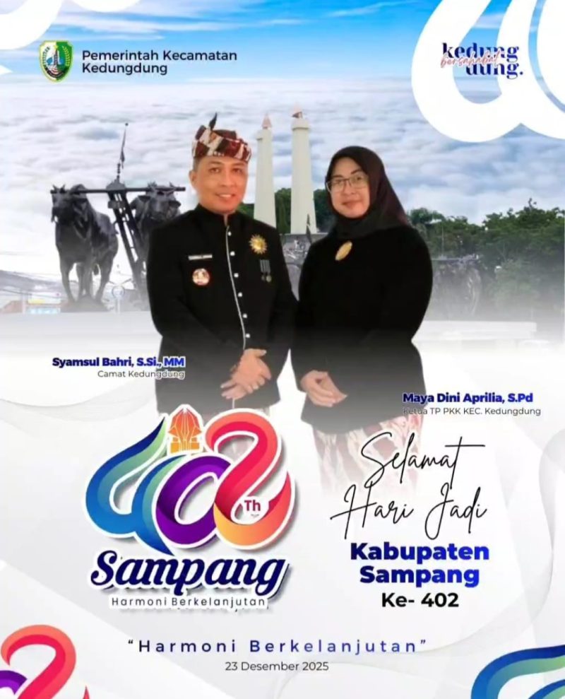 Liputanmadura.com (Sampang) Jawa Timur – Keluarga besar Pemerintah Kecamatan Kedungdung, Kabupaten Sampang, Madura, Syamsul Bahri, S. Si.,MM. Camat Kedungdung beserta Ketua TP PKK Kecamatan Kedungdung Maya Dini Aprilia, S.Pd Menyampaikan Selamat Hari jadi Kabupaten Sampang yang ke 402 tahun ” Harmoni Berkelanjutan ” Selasa 23 Desember 2025.